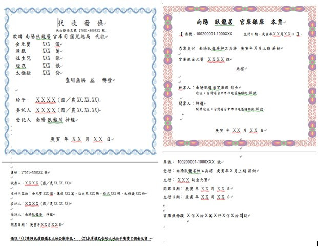 例如臥龍居本部神龍欲交付壹仟貳佰錠金元寶,給予臥龍居全體神工兵將的十二月份薪資,委請臥龍居官庫司代收並發放這筆款項,「代收條」的寫作如下: